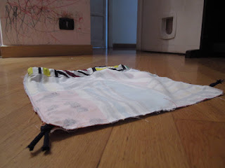 - Ora fate in modo che le due parti di tessuto siano dritto contro dritto come ho cercato di mostrare nella foto. Iniziate a cucire i bordi laterali facendo attenzione a fermarvi qualche centimetro prima dell'angolo per poter lasciare lo spazio per infilare il cordoncino.